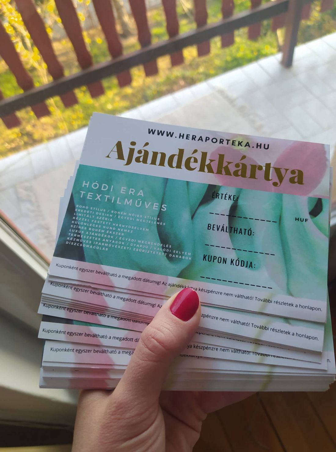 Díszborítékba érkezik hozzád egy heraportéka ajándékkártya amely összeget és egy kódot fog tartalmazni ami alapján beváltható 6 hónapon keresztül bármelyik heraportékára és a szállításra is. Ha más címletben ajándékoznál, kérlek értesíts vásárlás után! (pl. 8 db-t vásárolsz és 4 ajándékozottad lesz 10000-10000ft értékben)