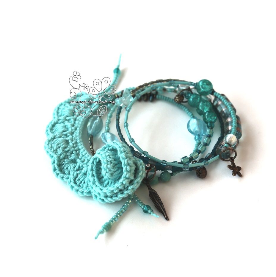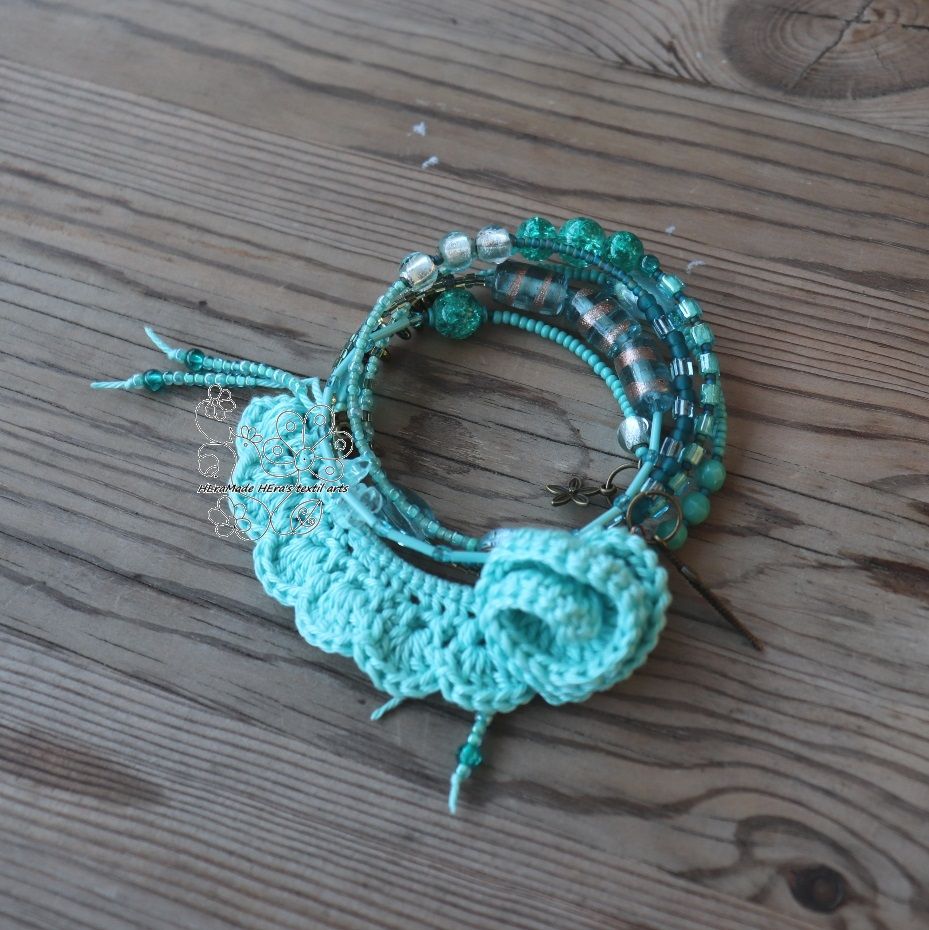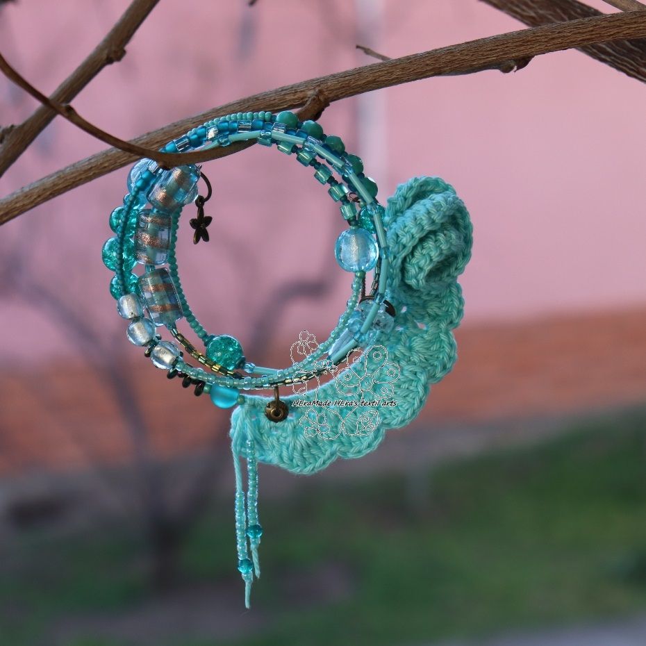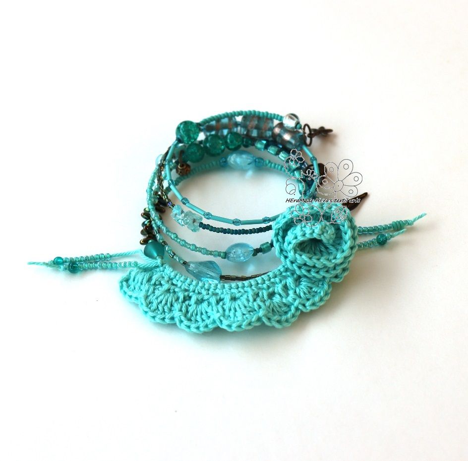 Anyaga: horgolt pamut csipke, rózsa és szív, ásványgyöngyök, memória drót, fém gyöngyök, csiszolt üveggyöngyök