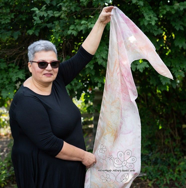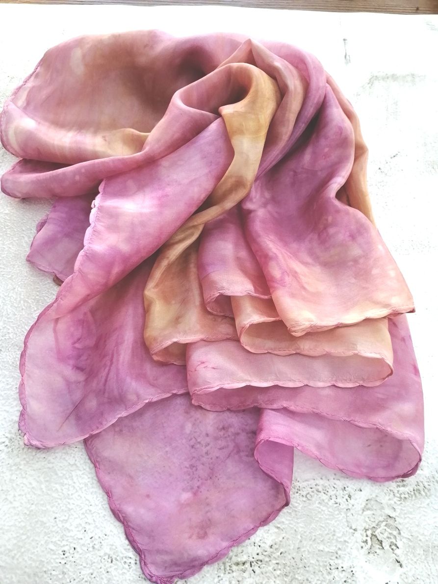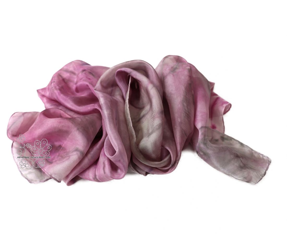 Kézzel festett lila és bordós mályvás színárnyalatok gyűrt felületű hernyóselyem kendőn. A színhatások szerelmeseinek ajánlom. Egyedi exkluzív ajándék.