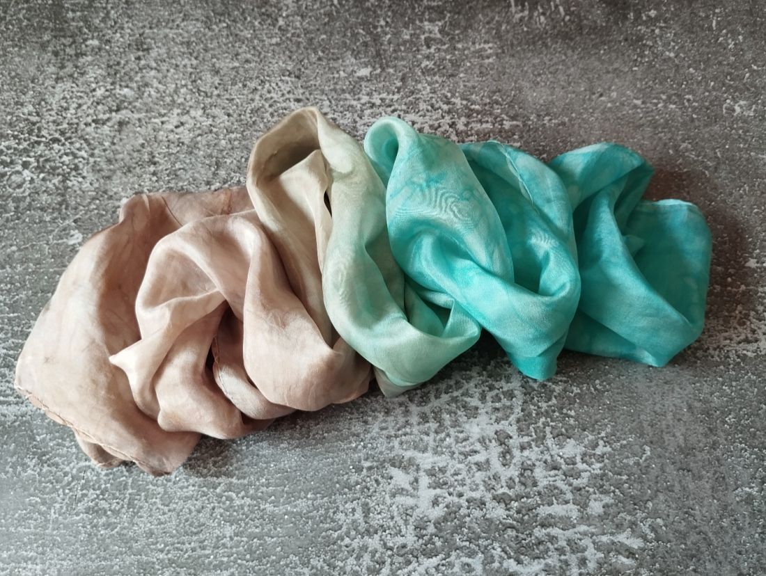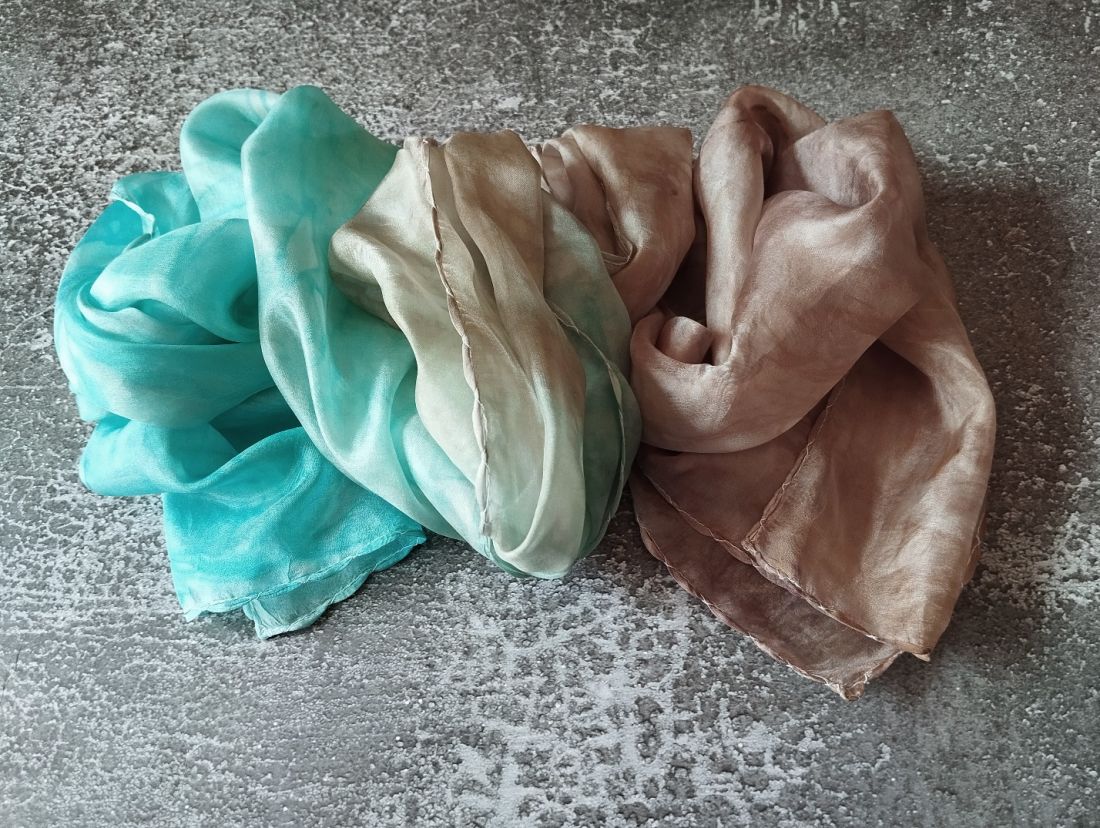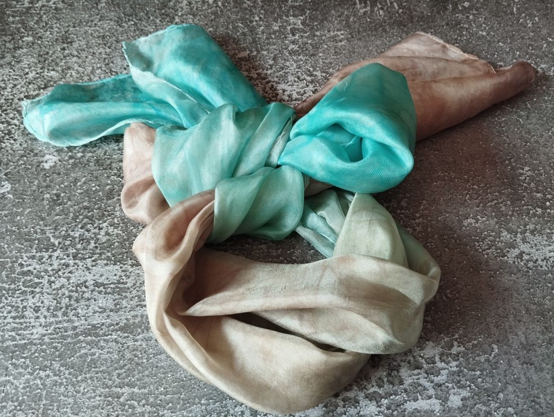 Balaton színátmenetes hernyóselyem kendő kézzel festett valódi selyem hajkendő Megrendelésre készül. 65x65cm méretben rendelhető hernyóselyem kendő Bármilyen két szín és ezeknek a színátmenetével készül.