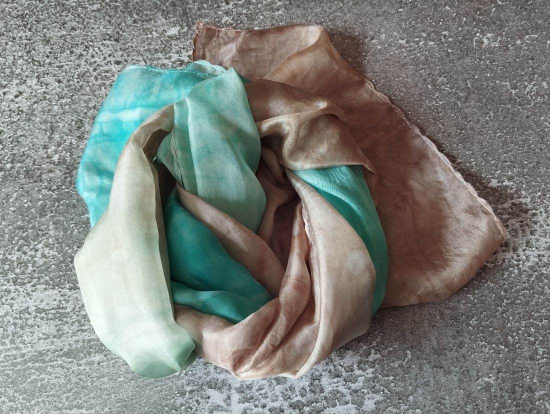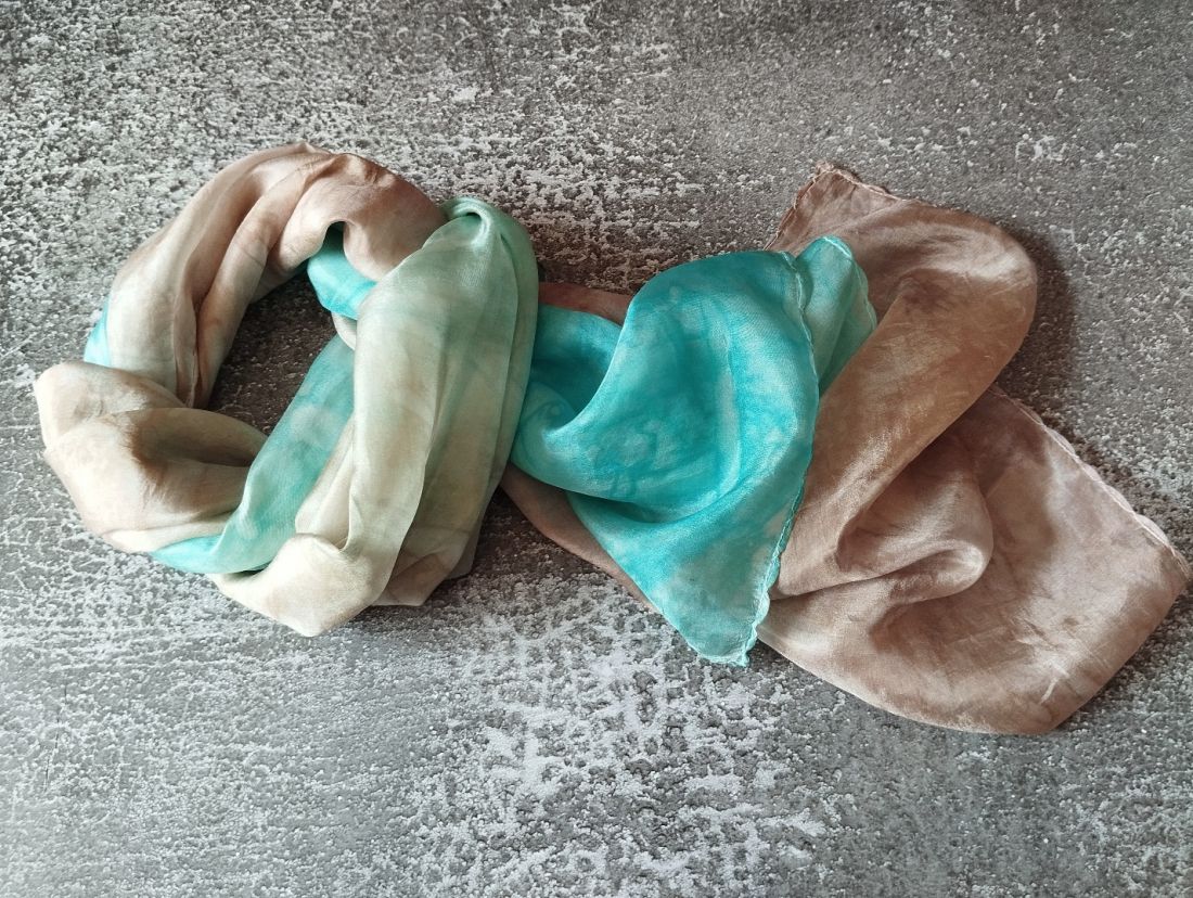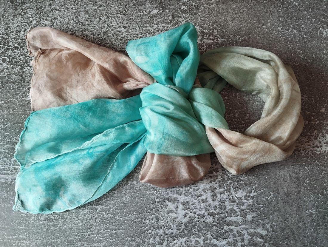 Balaton türkiz és barna színátmenetes hernyóselyem kendő kézzel festett valódi selyem hajkendő 90x90cm hideg árnyalatokban