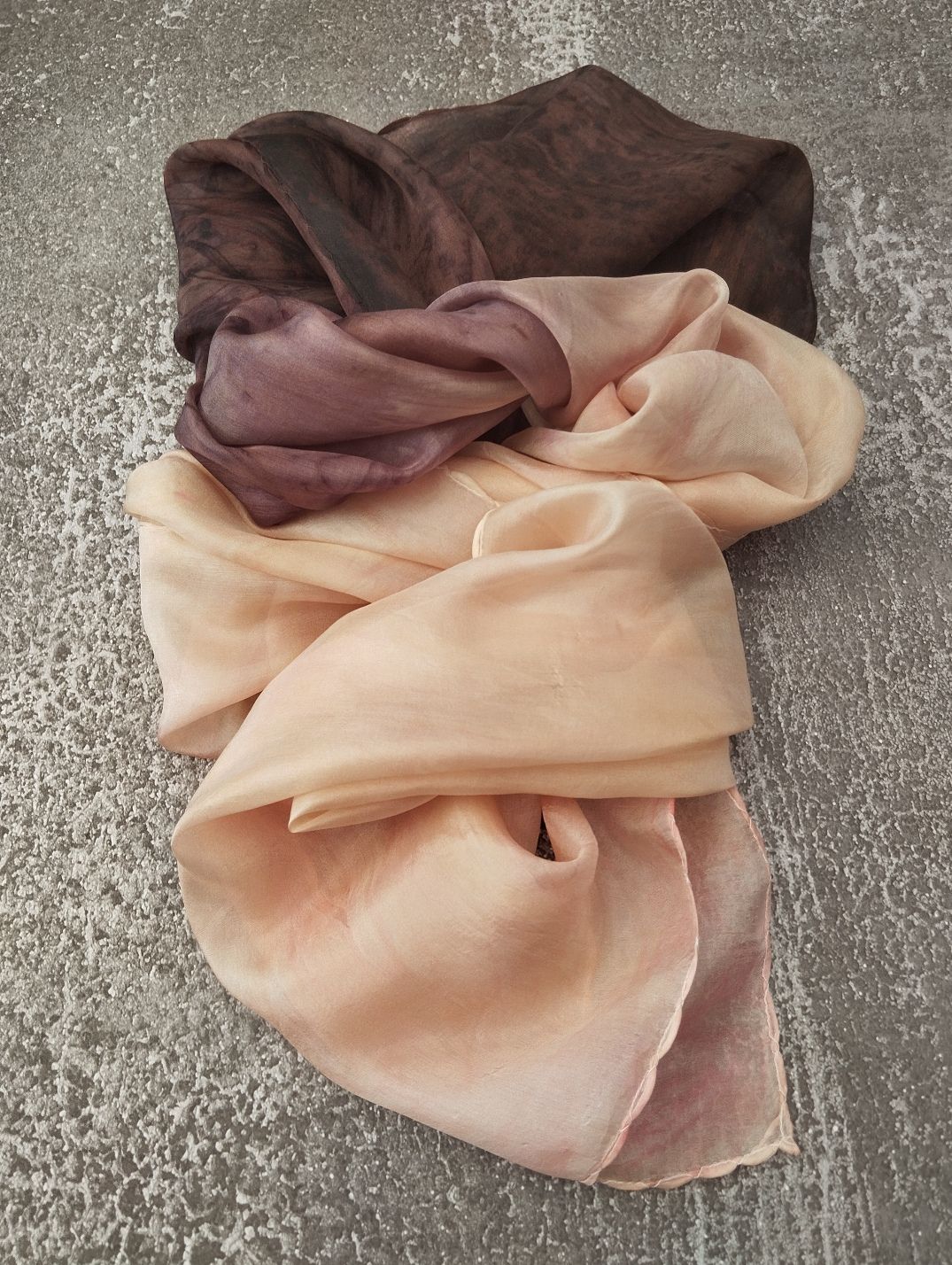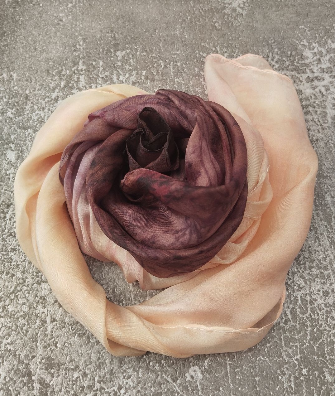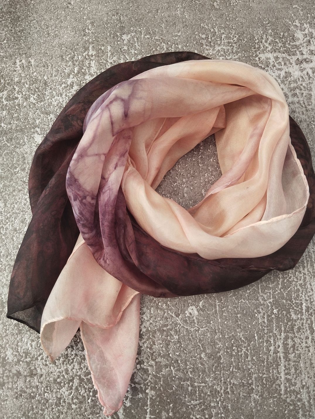 Színátmenetes, ombre festésű, márványozott hernyóselyem sálam csokoládé barna és púder hamvas barackos rózsaszín keveredése.