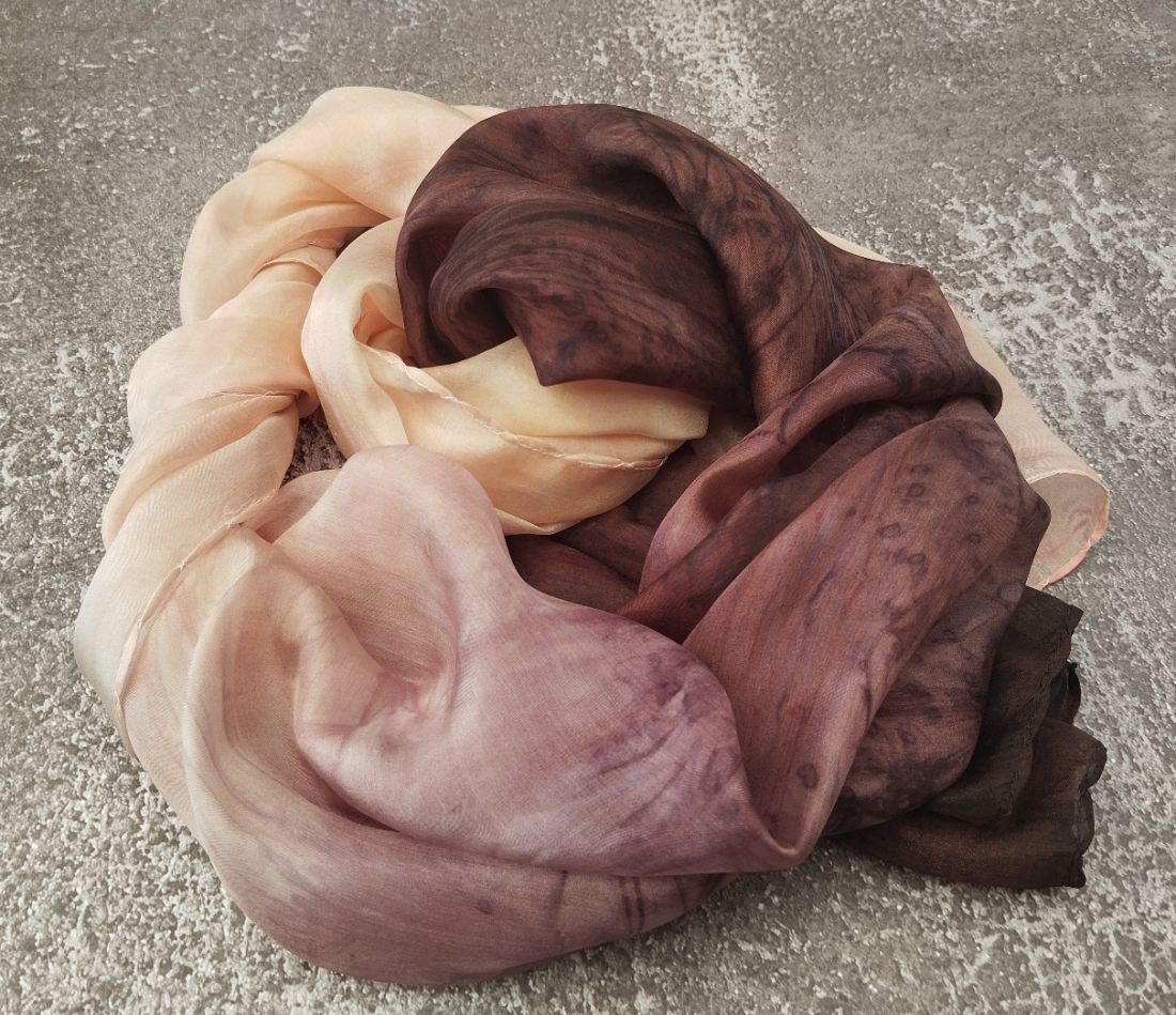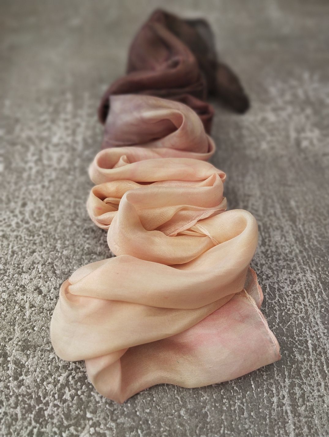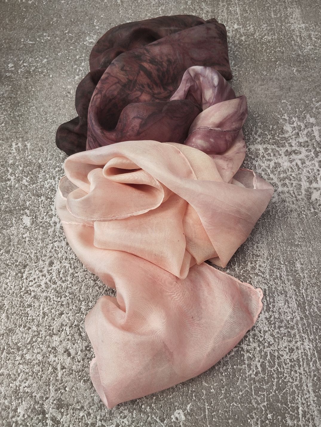 Színátmenetes, ombre festésű, márványozott hernyóselyem sálam csokoládé barna és púder hamvas barackos rózsaszín keveredése.