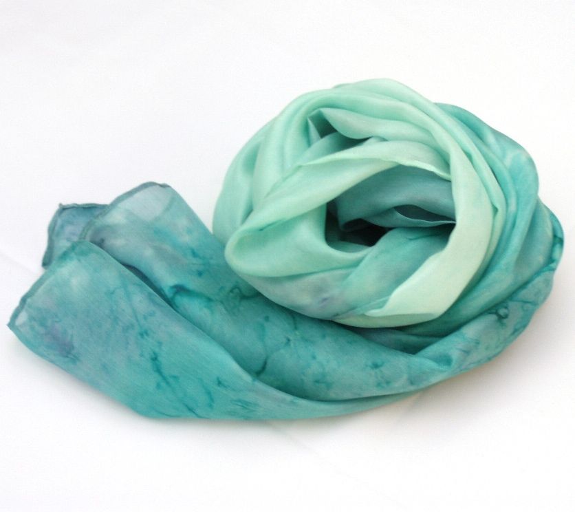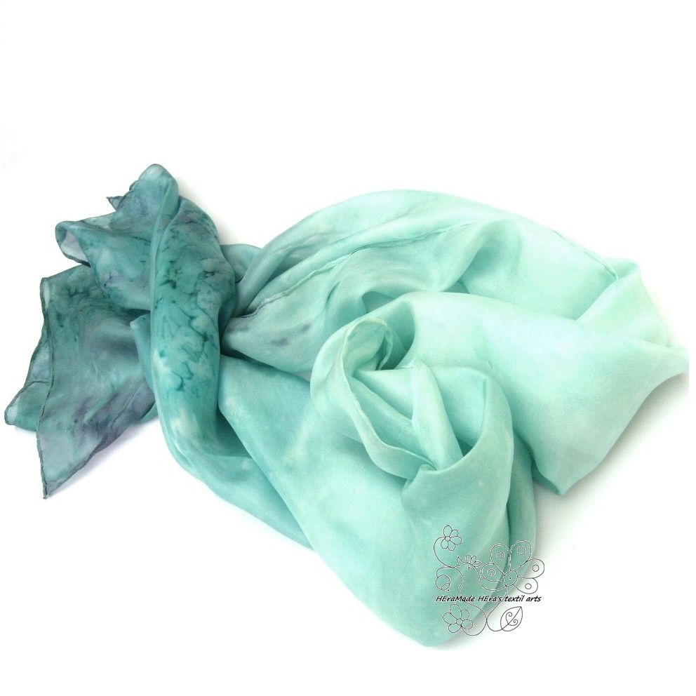 A fő foton lévő szín mintadarab türkizzöld női selyem sál türkiz zöldek színátmeneteivel kézzel festett. (Ugye te is imádod ezt a színt mint én) A közepe világosabb, a keskeny végein sötétebb árnyalatú, színátmenetes, ombre. A felületen a márvány mintát ecsettel alakítom egy saját ötletű festési technikával.