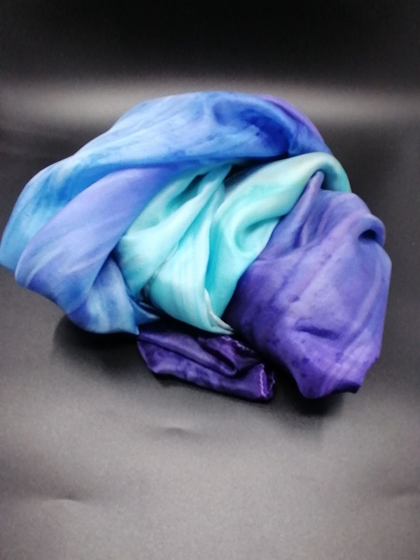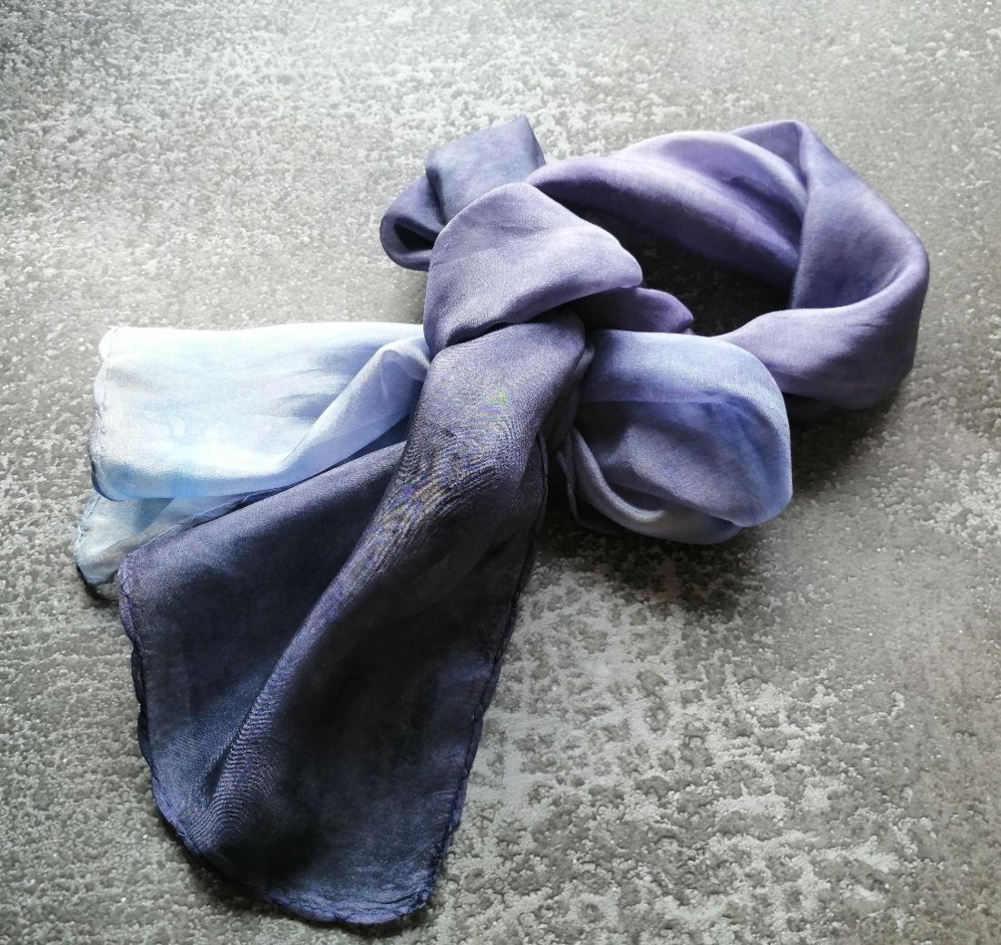 Balaton színátmenetes hernyóselyem kendő kézzel festett valódi selyem hajkendő Megrendelésre készül. 65x65cm méretben rendelhető hernyóselyem kendő Bármilyen két szín és ezeknek a színátmenetével készül.