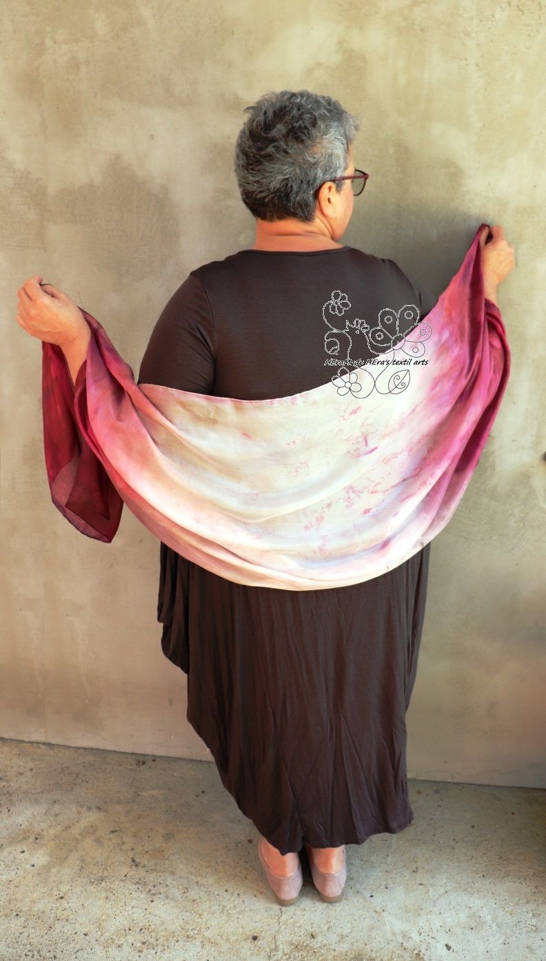 Kézzel festett lila és bordós mályvás színárnyalatok gyűrt felületű hernyóselyem kendőn. A színhatások szerelmeseinek ajánlom. Egyedi exkluzív ajándék.