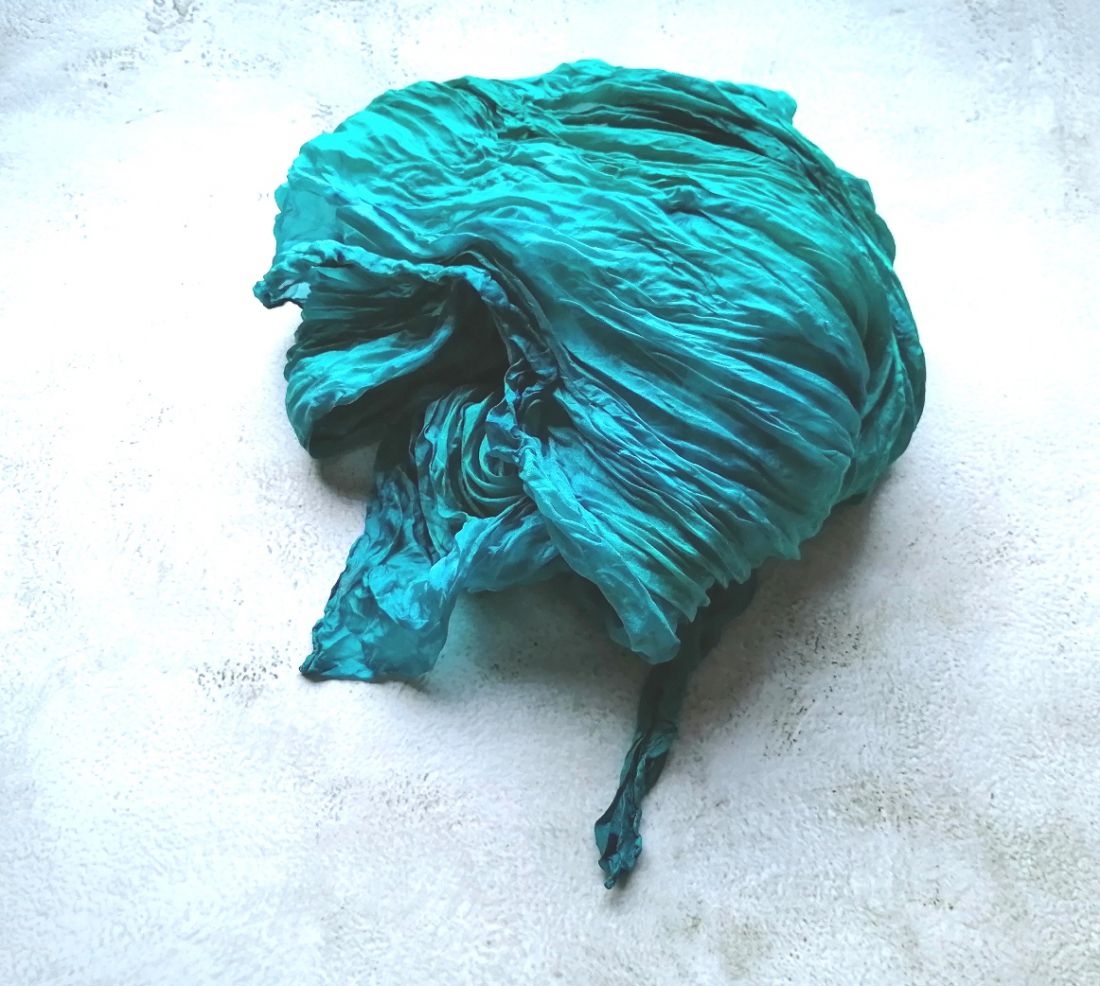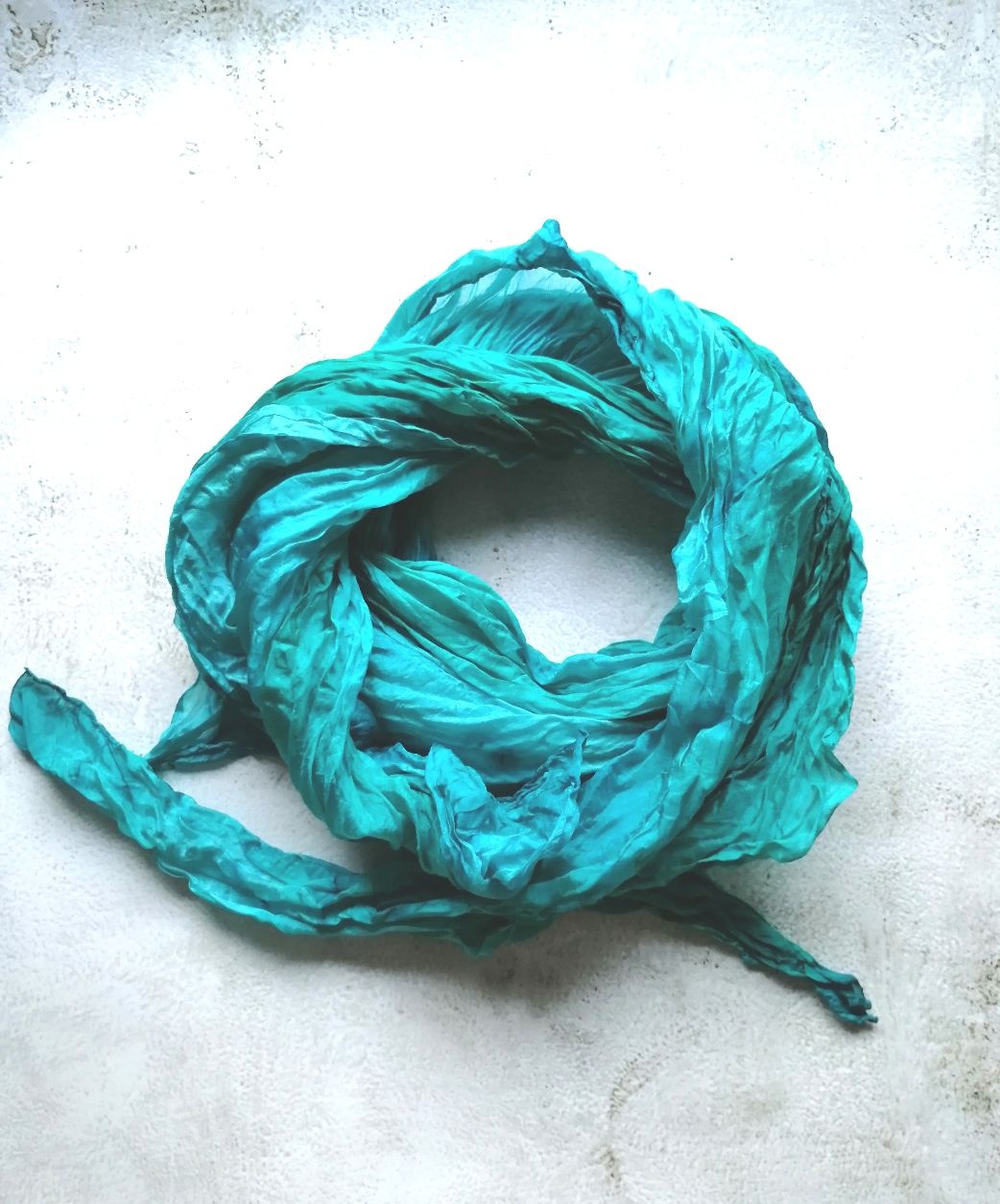 Balaton színátmenetes hernyóselyem kendő kézzel festett valódi selyem hajkendő Megrendelésre készül. 65x65cm méretben rendelhető hernyóselyem kendő Bármilyen két szín és ezeknek a színátmenetével készül.