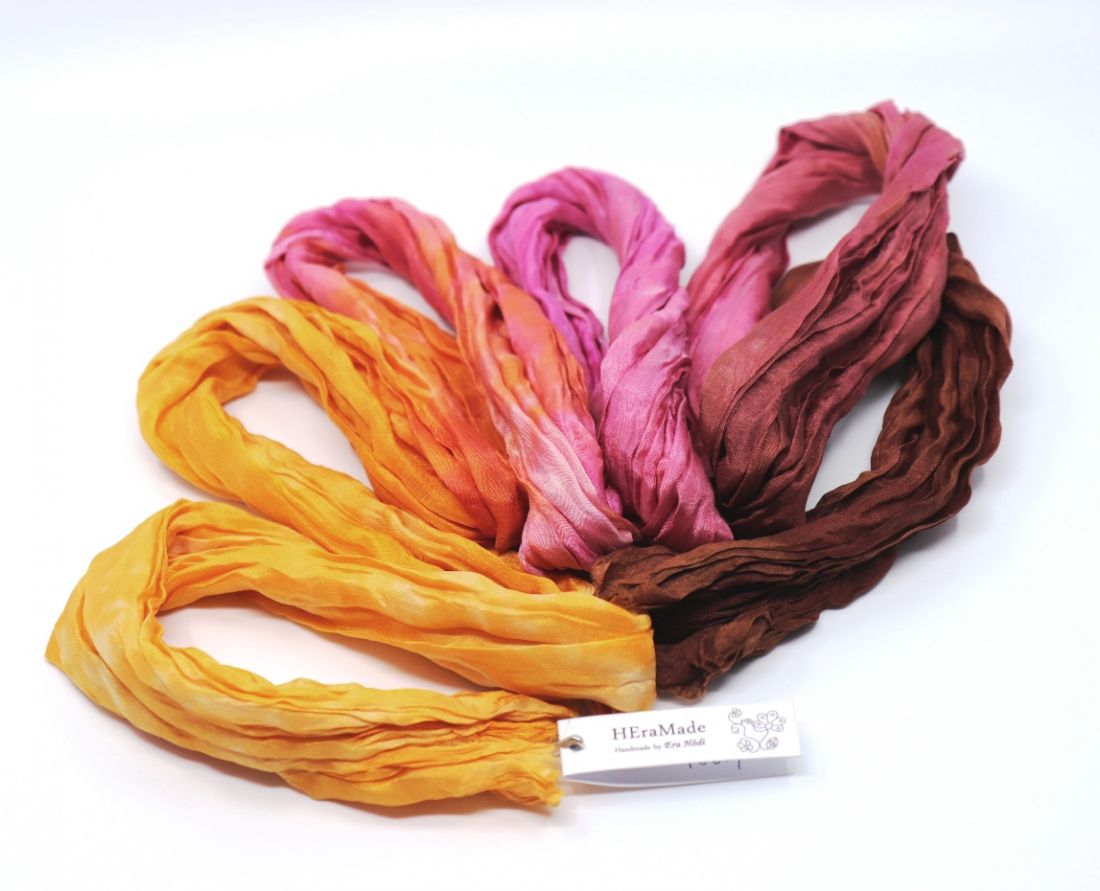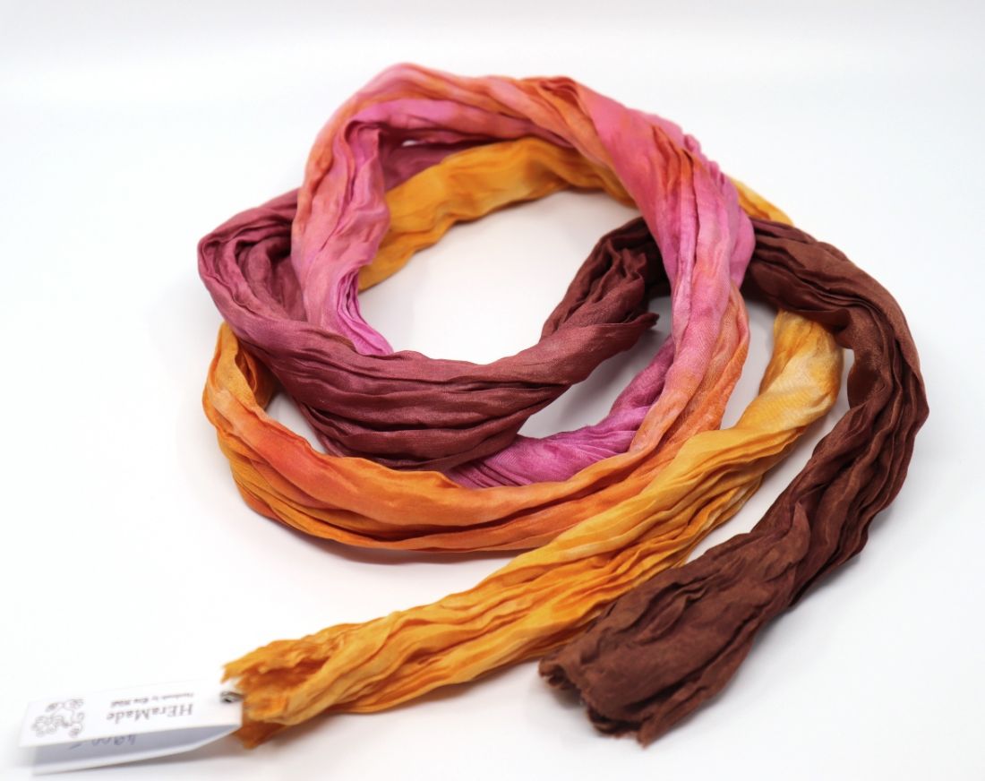 Anyaga bőrbarát természetes hernyóselyem. Enyhén fényes felületű selyemféle, nem átlátszó A végei nem szegettek. Festék gőzöléssel rögzített.