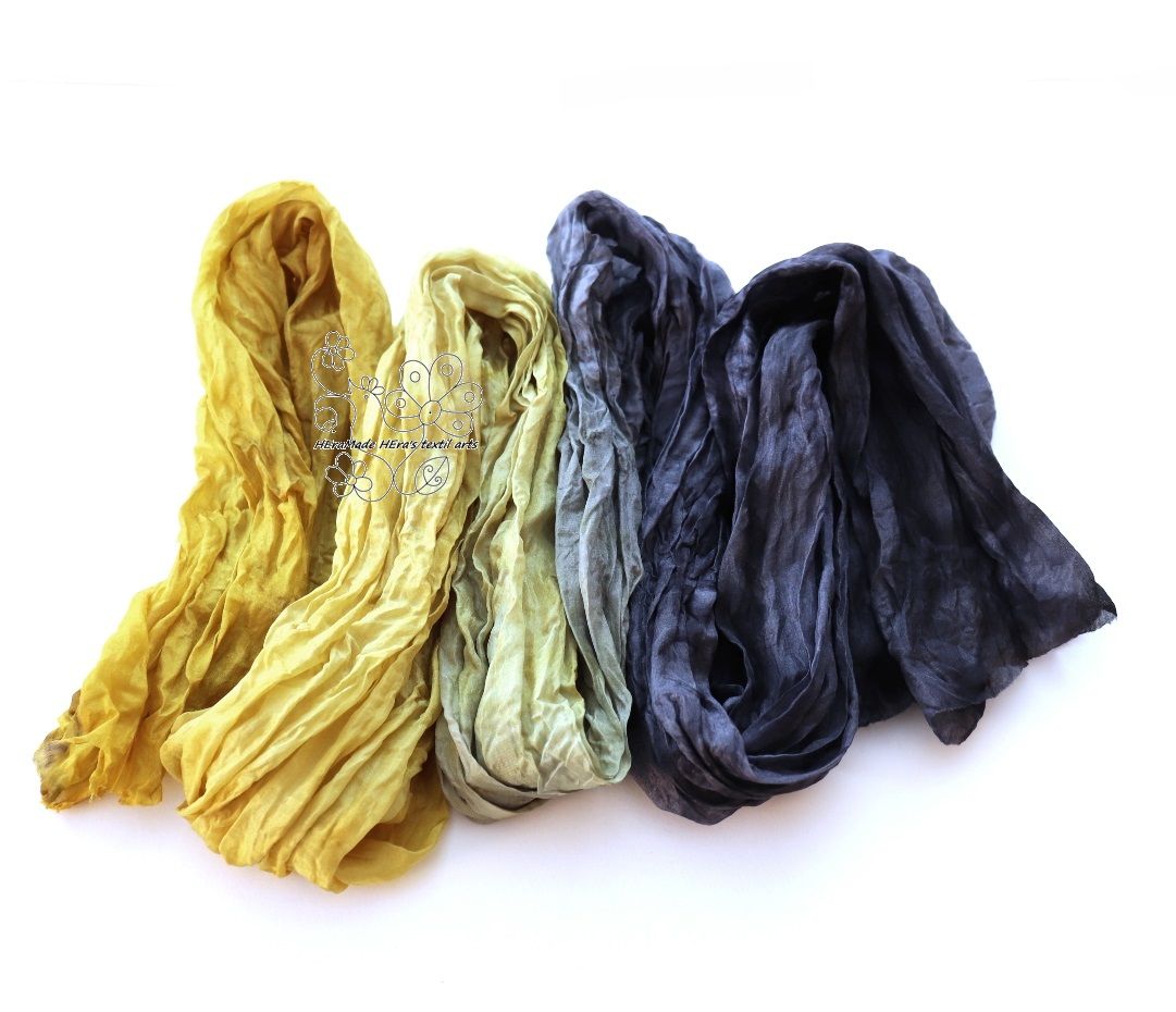 Anyaga bőrbarát természetes hernyóselyem, kicsit gyűrve. Enyhén fényes felületű selyemféle, nem átlátszó A rövidebb végei nem szegettek, hosszában összevarrva. Festék gőzöléssel rögzített.