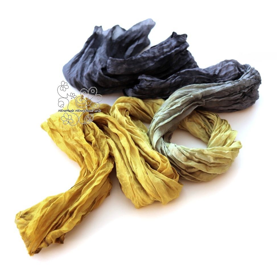 Mustár és fekete hosszú sál gyűrt hernyóselyem