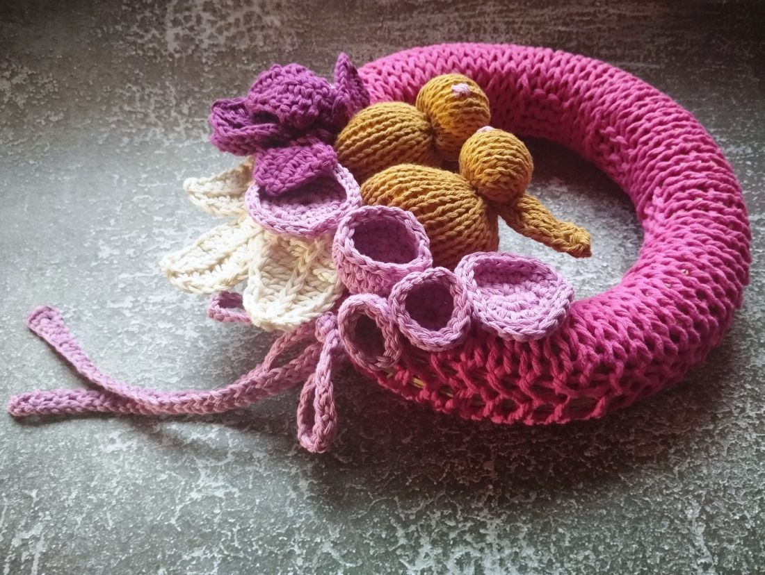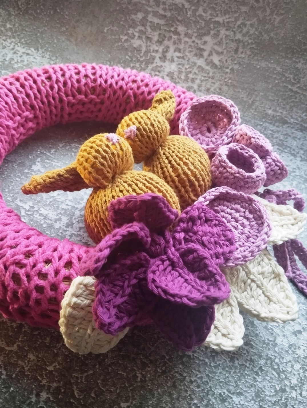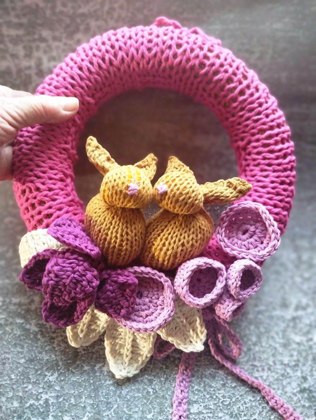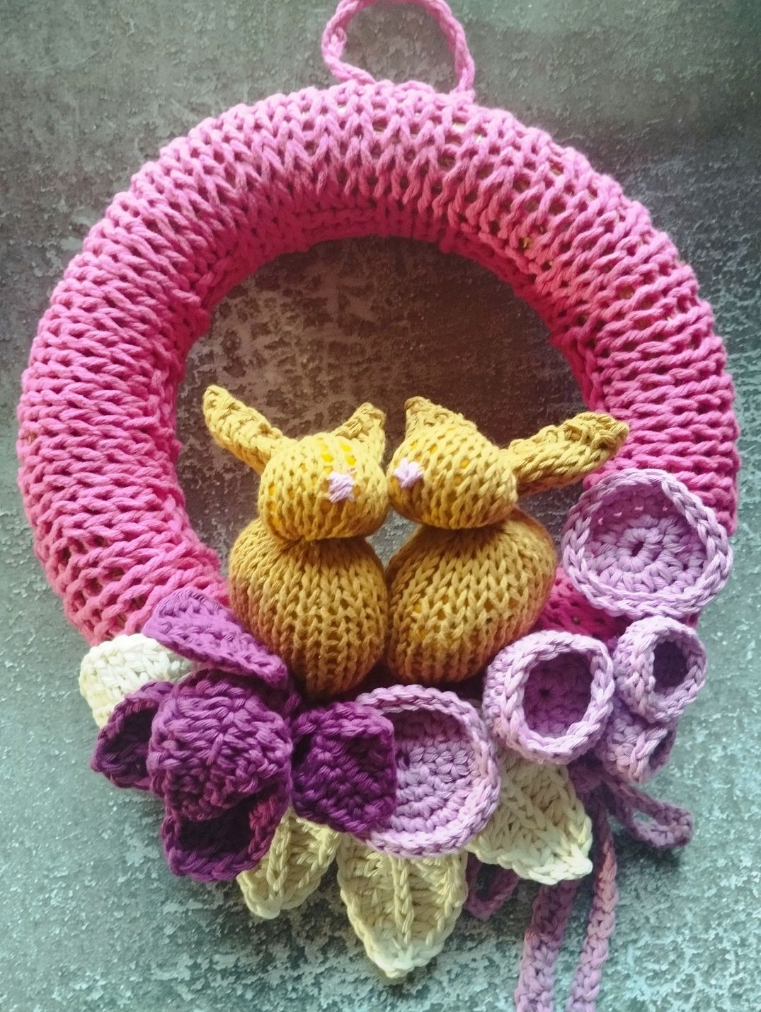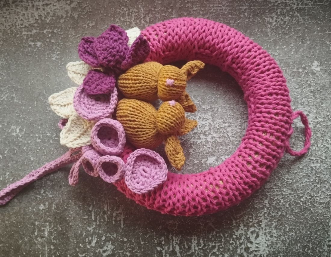 Szalma alapú kötött horgolt textil dekoráció húsvéti nyuszikkal levelekkel, virágokkal.