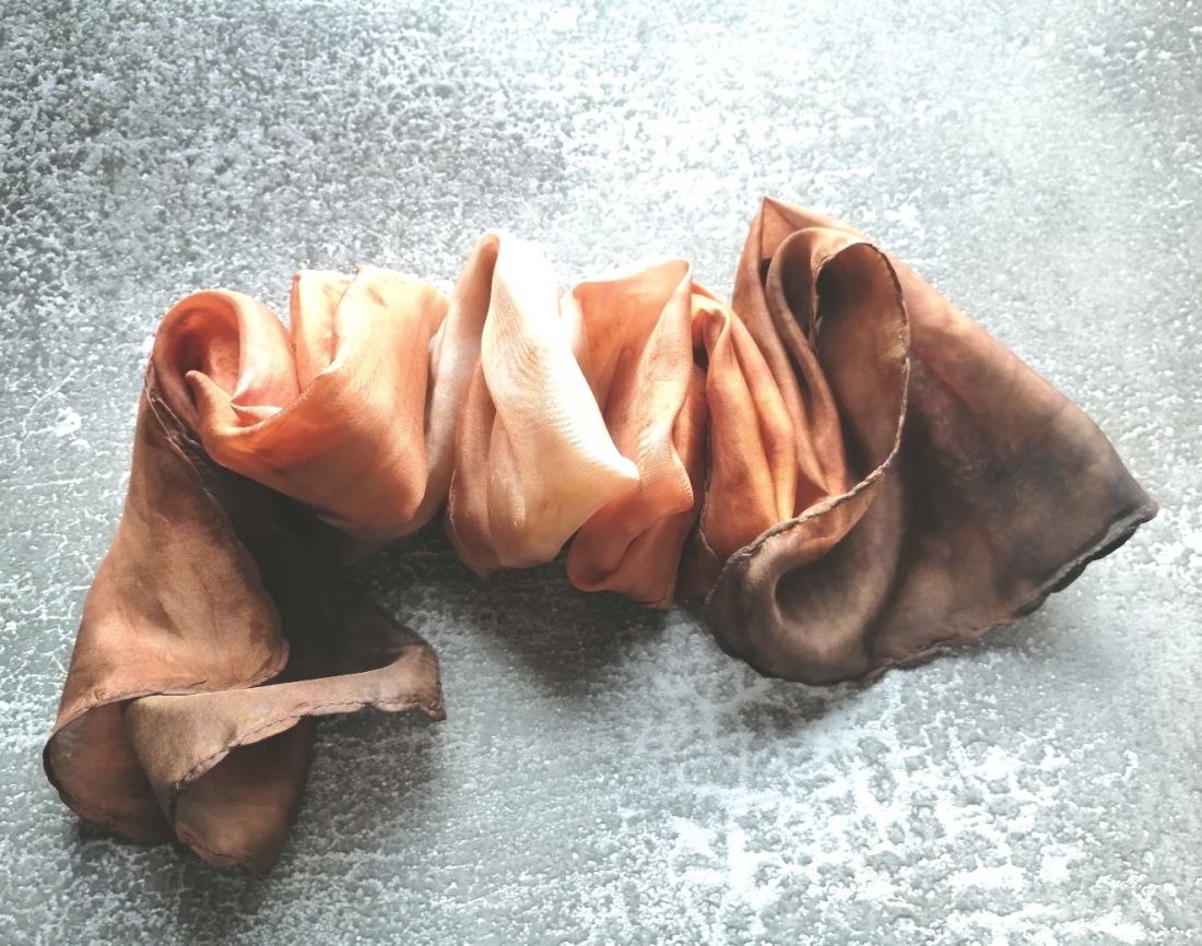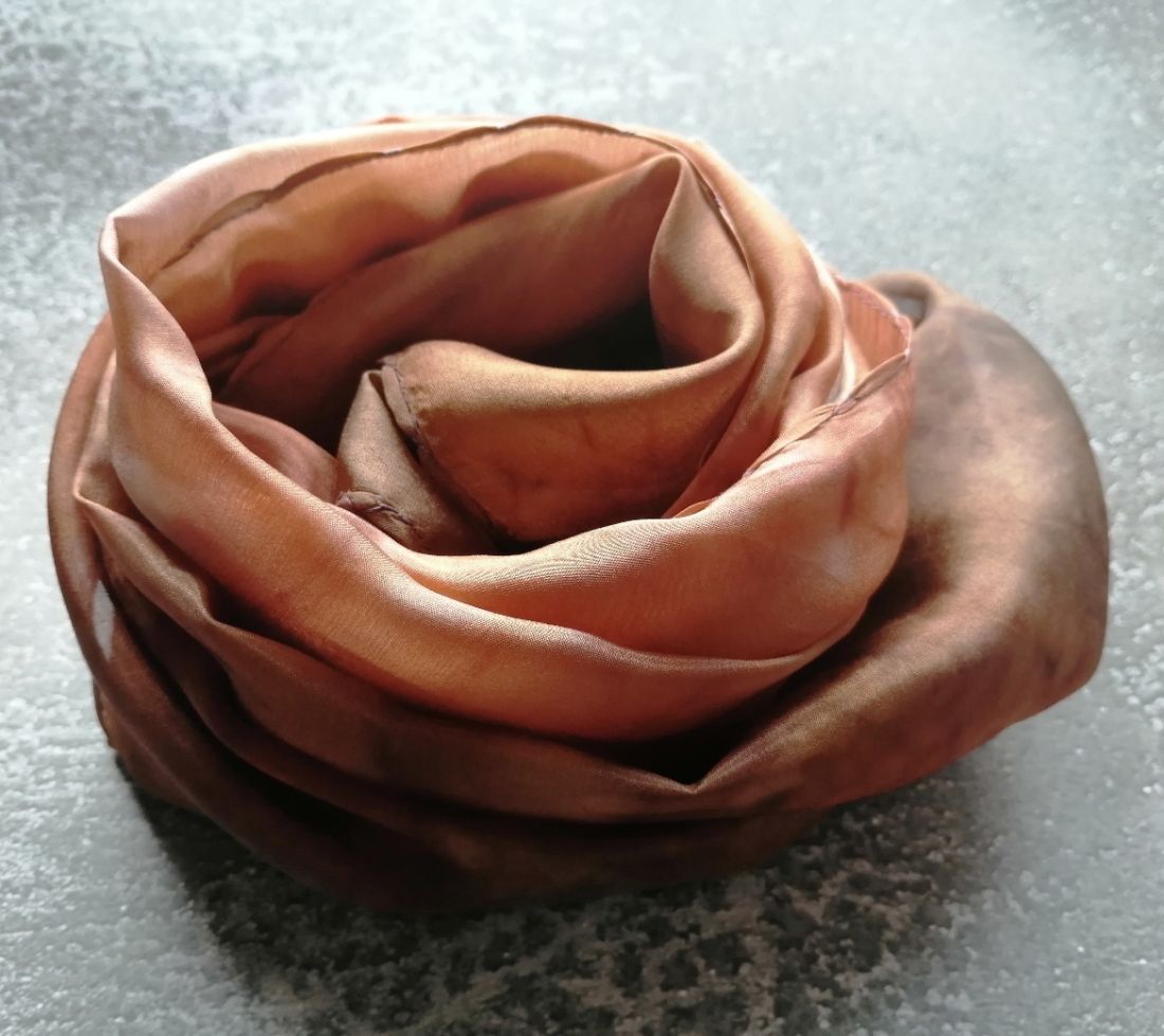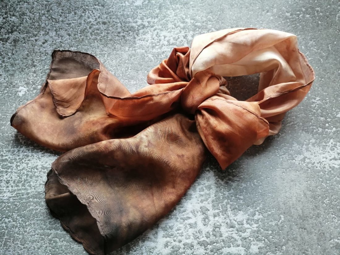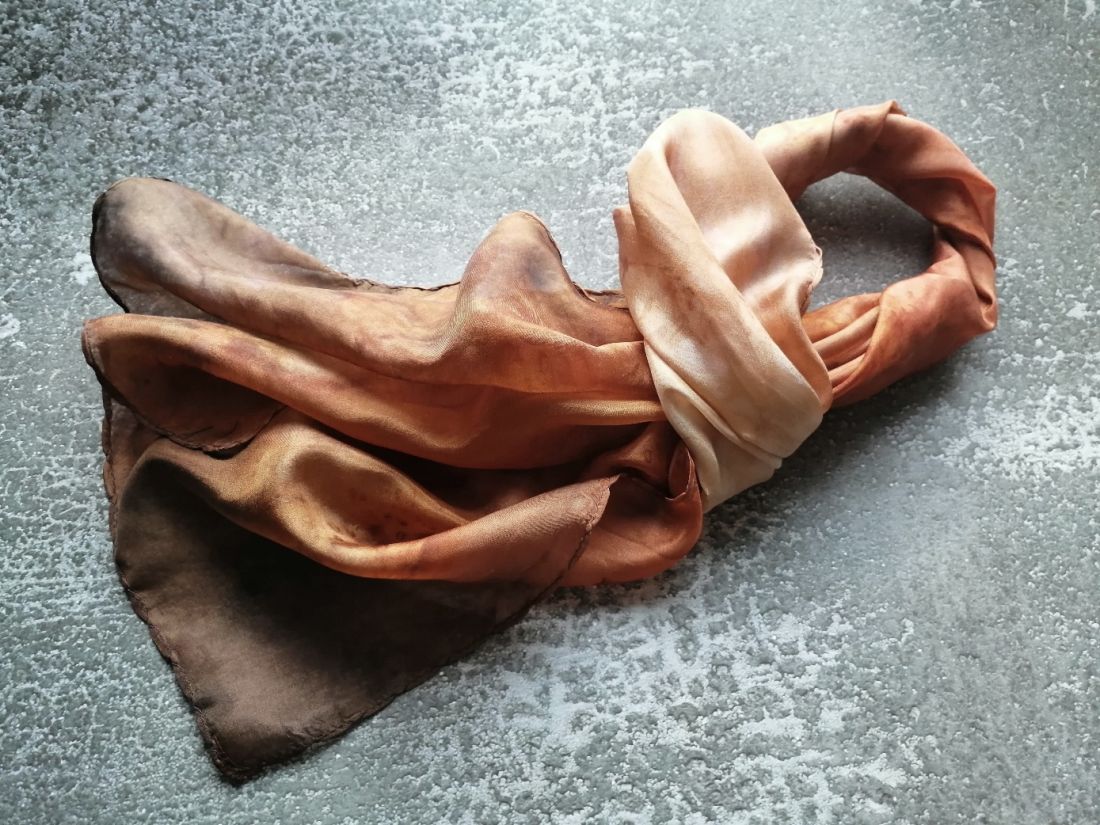 Karamell és csokoládé, némi vörösbarna márványos színátmeneteivel kézzel festett hernyóselyem sál. Enyhén fényes felületű selyemféle, nem átlátszó.