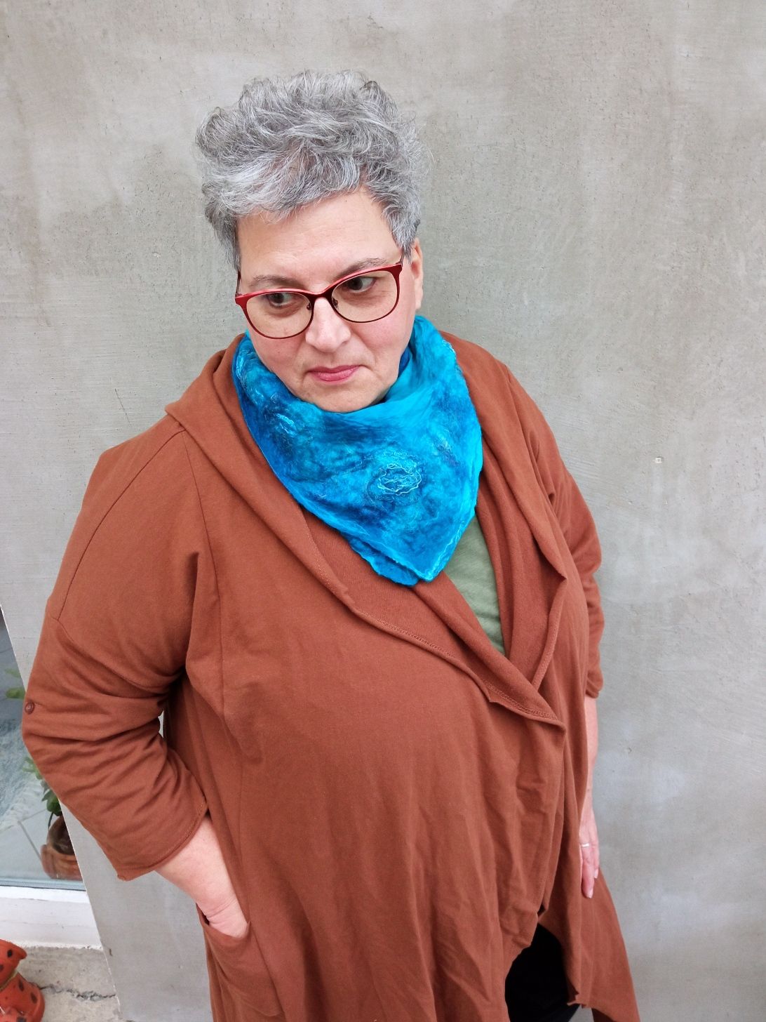 Anyaga: 100% hernyóselyem pongée és 100% merinó gyapjú kombinálva.