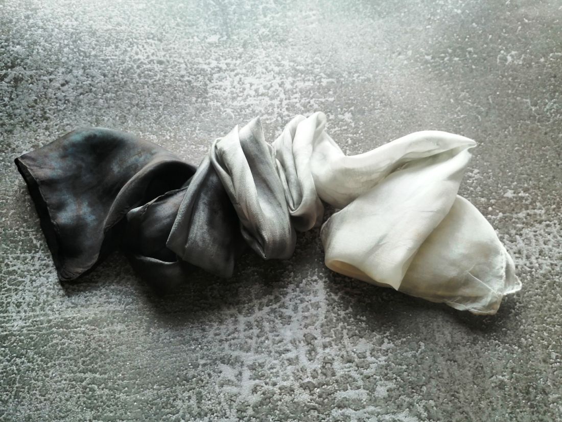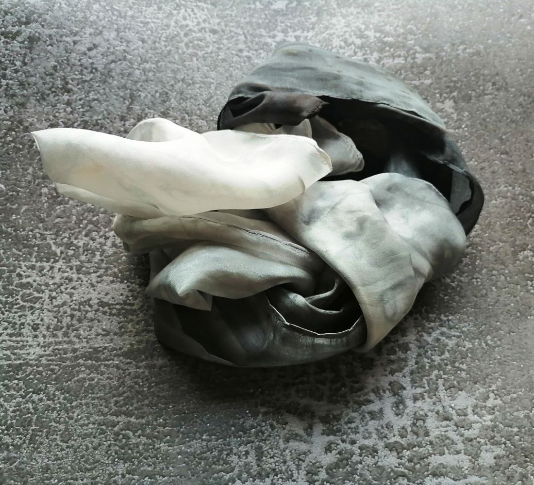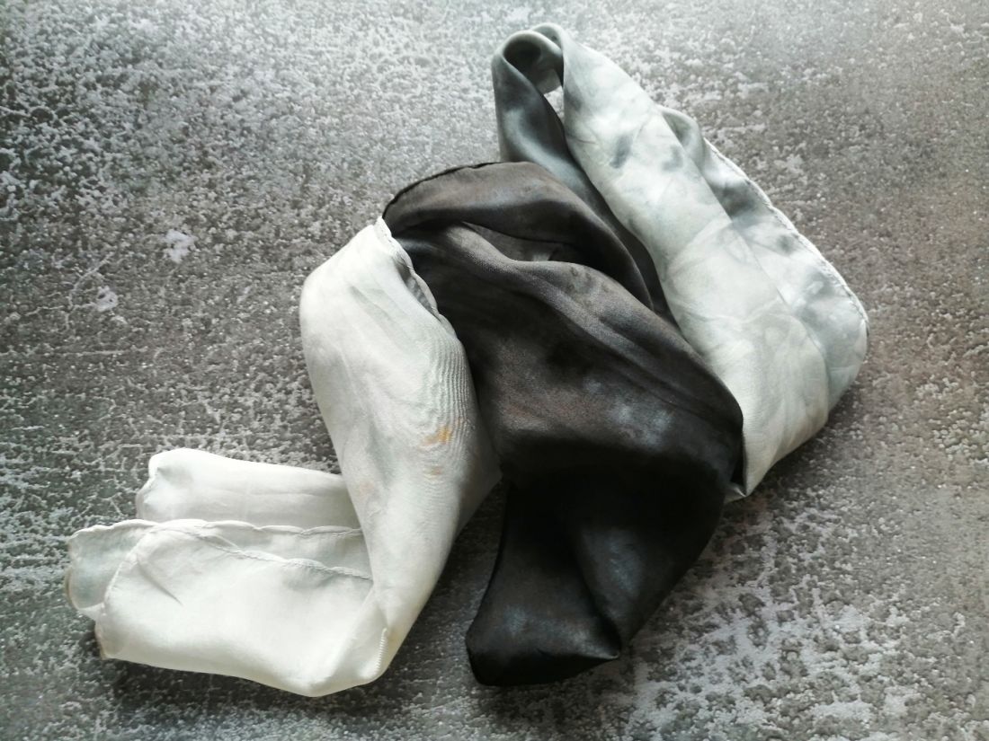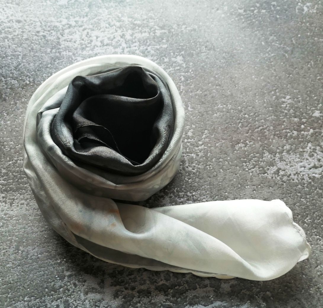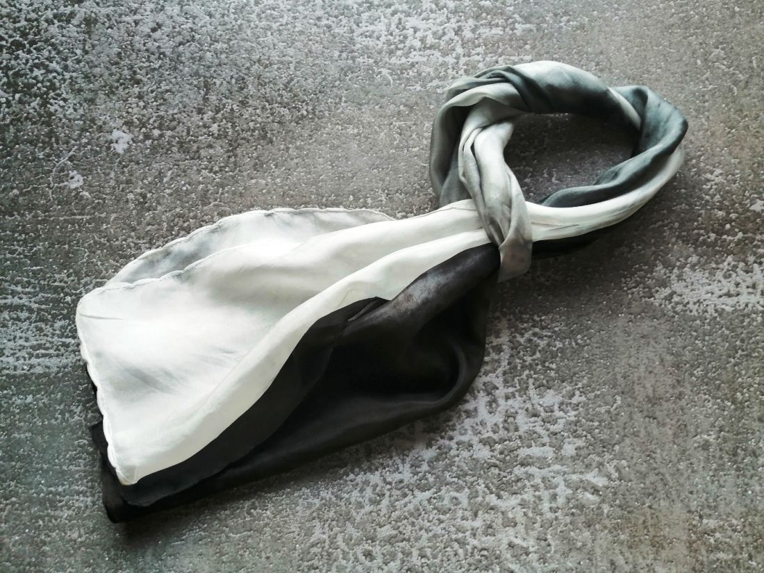 Fekete, szürke, fehér márványos színátmeneteivel kézzel festettem sálamat. Enyhén fényes felületű selyemféle, nem átlátszó.