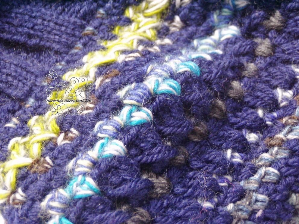Alapmintája nincs, a kezembe eső színben illő fonalak vastagsága és a színek ritmusa adja a mintáját. Így minden darab egyedi lesz. (Rendelhető más színvariációkban is!)