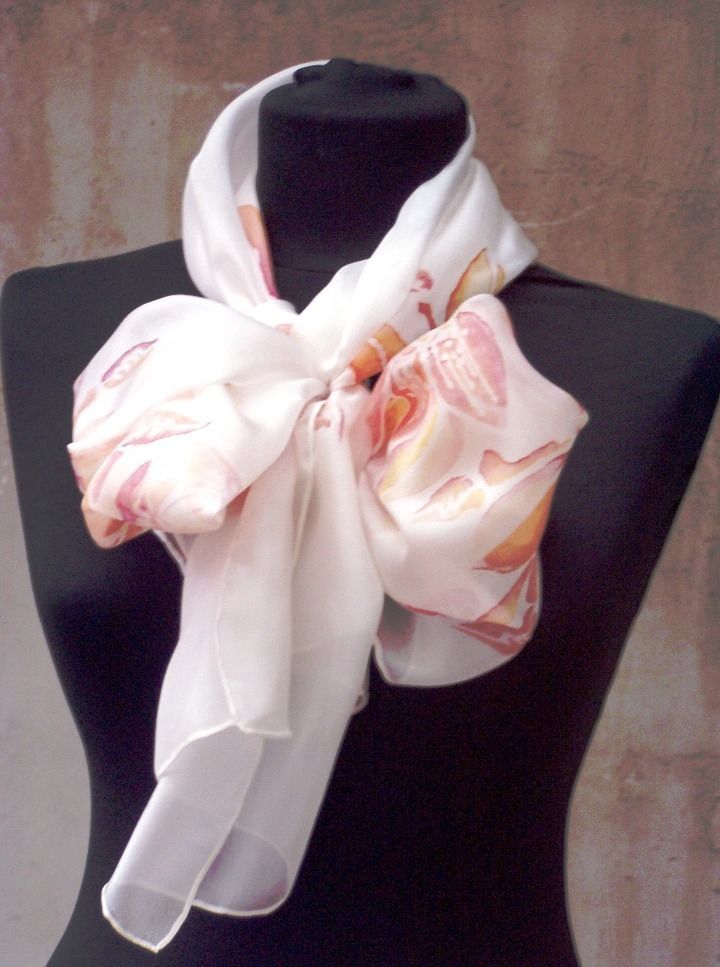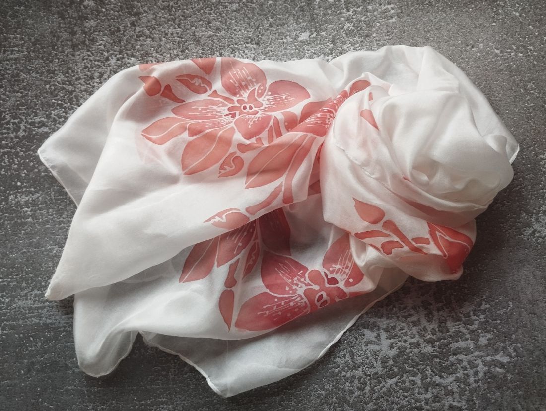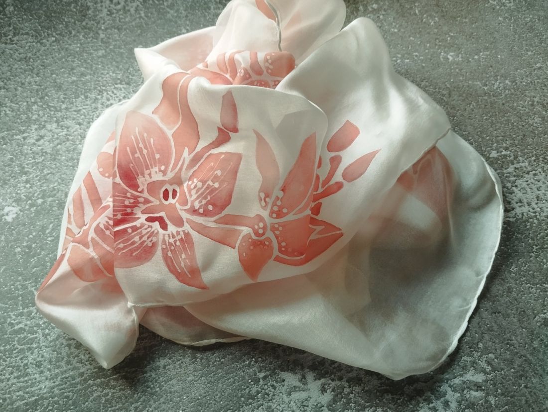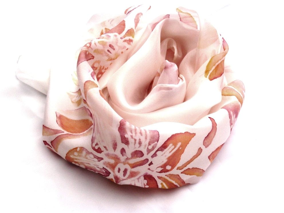 Alapszíne a nyers selyem színe. A mintát fakó narancsos és lazacos rózsaszín árnyalatokkal festettem.