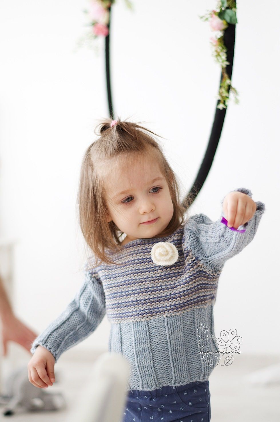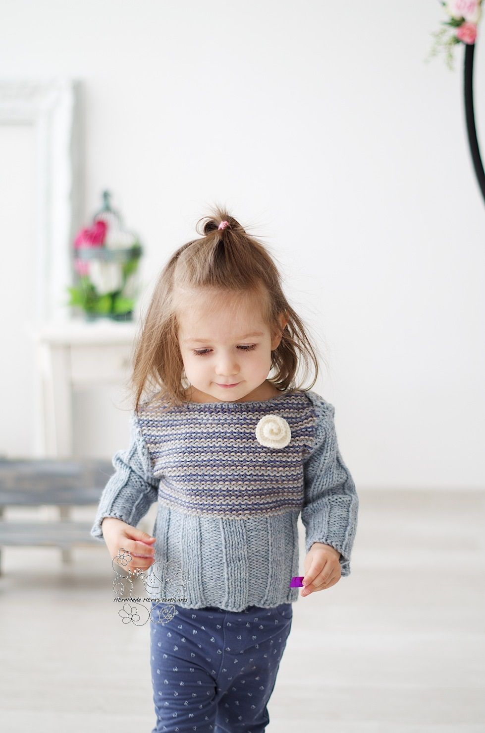 Pasztell csíkos pulóver virággal gyapjúból kislányoknak (oeko-tex gyapjú)