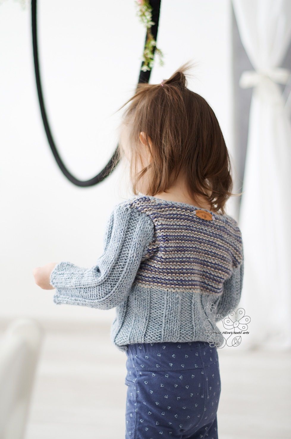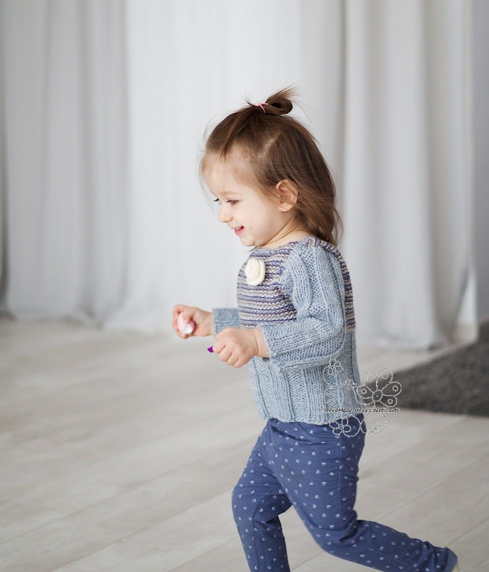 Ezt a pulóvert 1,5-2,5 éveseknek terveztem. Mercerizált gyapjú fonalból kötöttem elején gombbal záródik, bevarrott ujjú kényelmes darab. A nyakmegoldása egymást átfedő a vállrészen, ezért kényelmes az öltöztetés.
