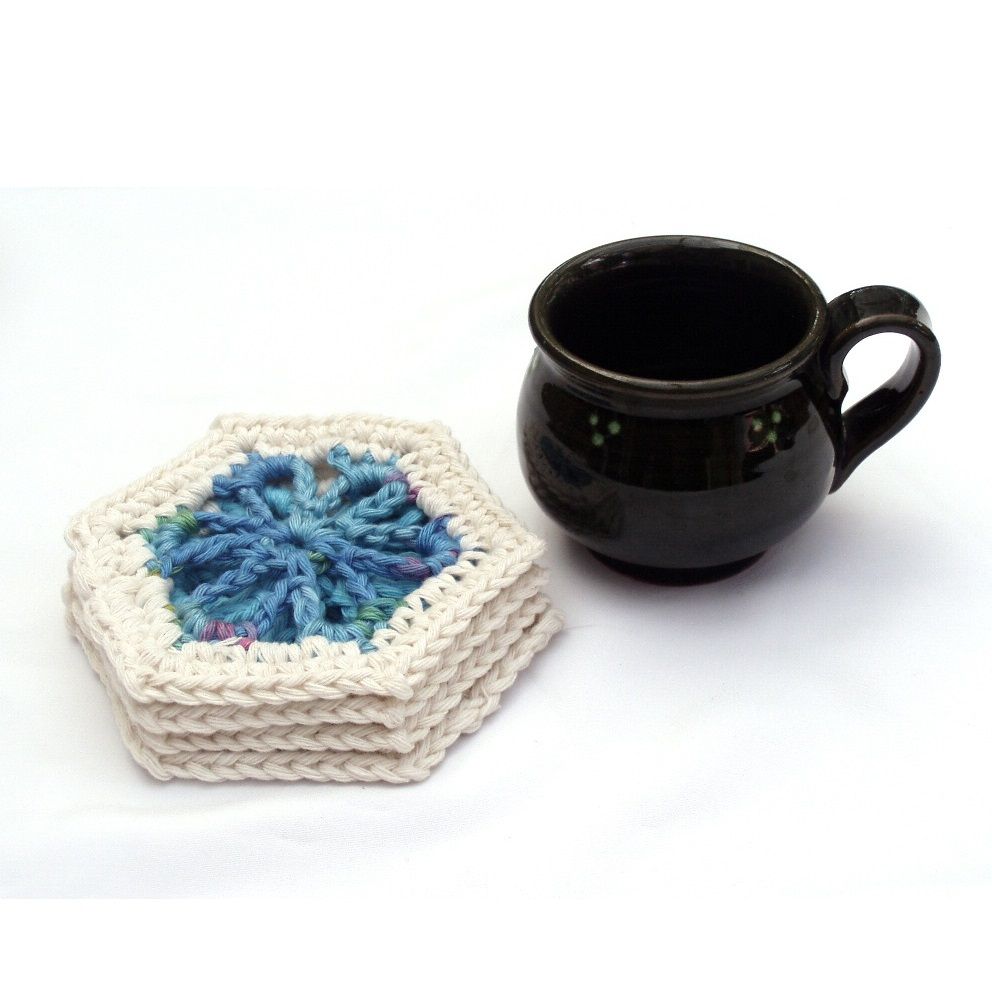 Egy jó beszélgetés a teraszon, vidám hangulatú kávézás, teázás remek asztal dekorációja. Tiszta pamut fonalból horgolással készítve.