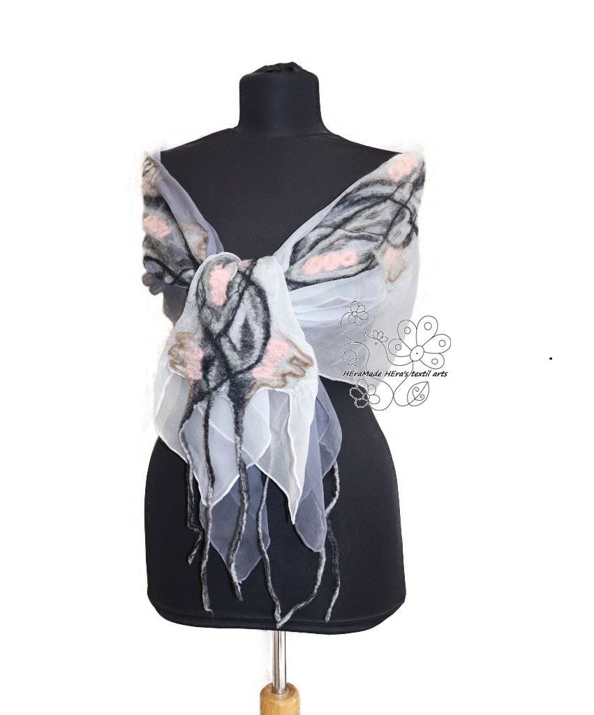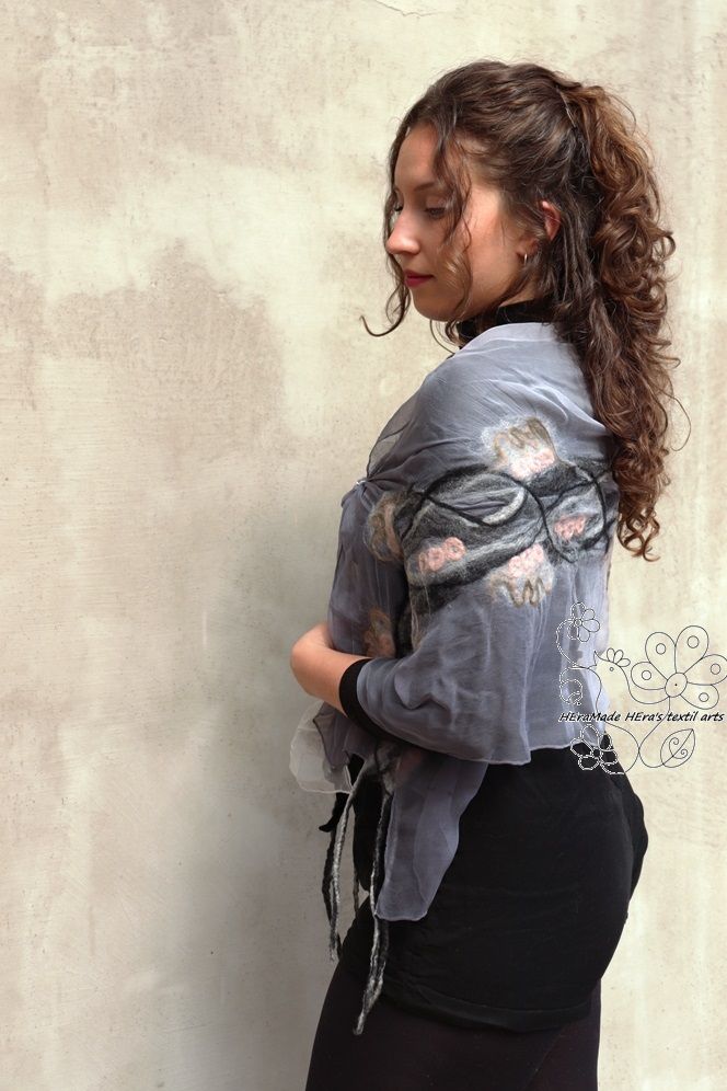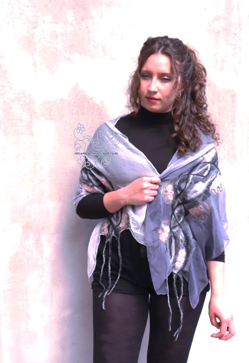 Szürke pasztell selyem gyapjú sál, indás virágos nuno nemez stóla