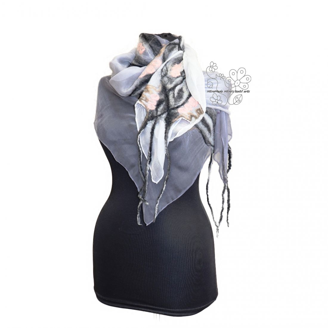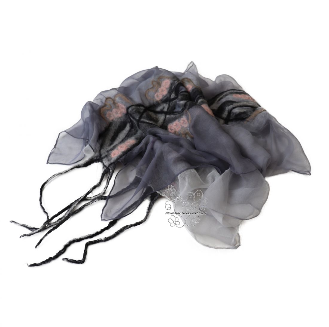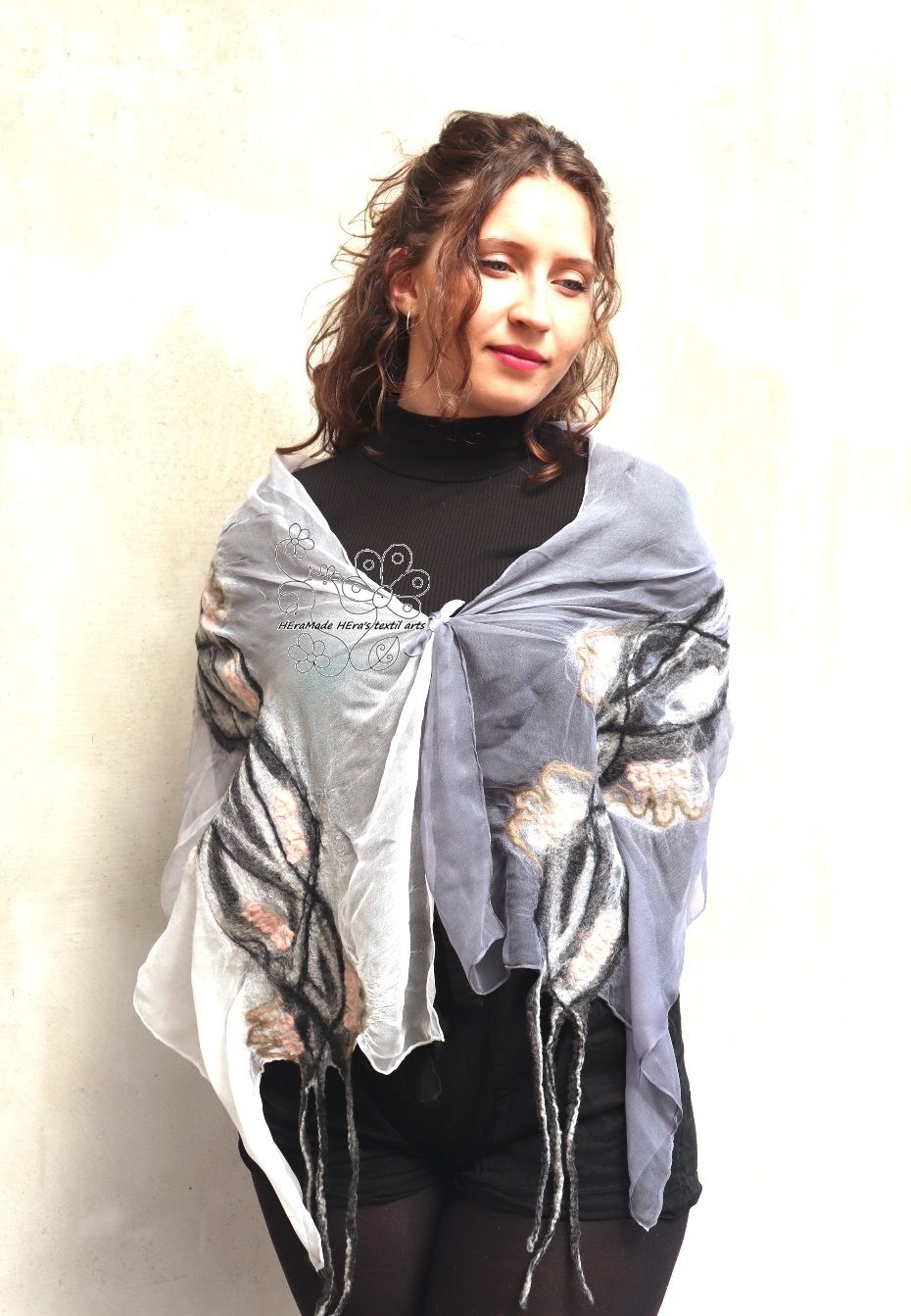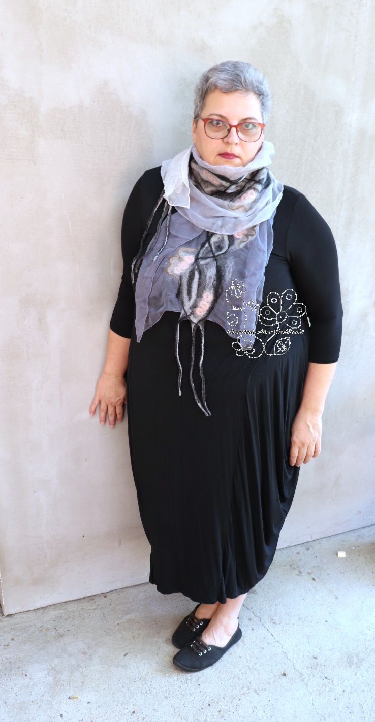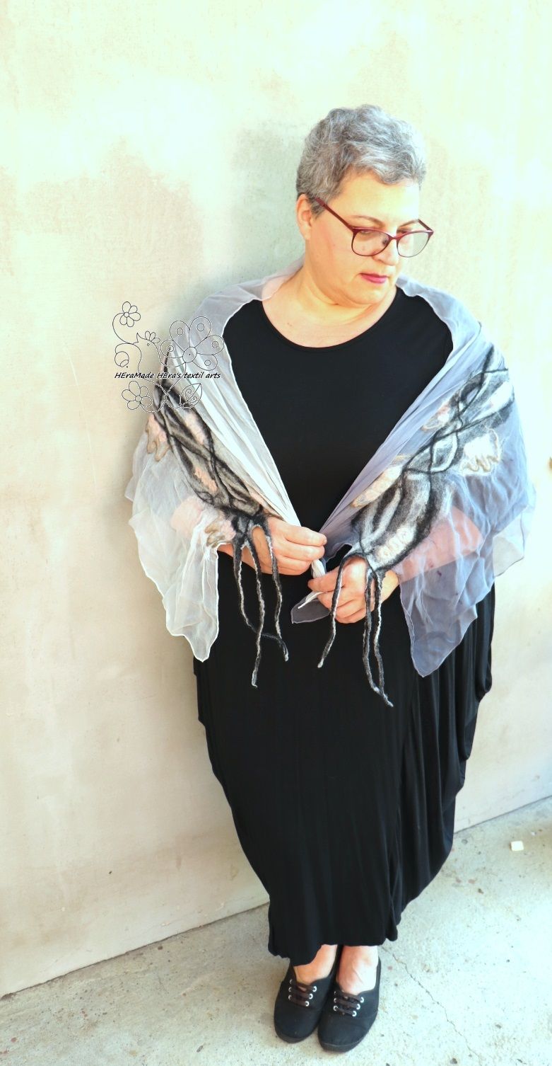 Nuno nemezeléssel készítettem finom anyagokból. Evvel a technikával a finom gyapjúszösz ötvöződik a nagyon finom szövésű hernyóselyemmel és egy új, jó tartású mégis puha anyagot képeznek együtt. A gyapjú nem az egész felületet borítja, csak a minták területét, általában a megmunkált darab felét takarja gyapjú, a többi rész hernyóselyem, ettől puha és kellemes tapintású a felület.