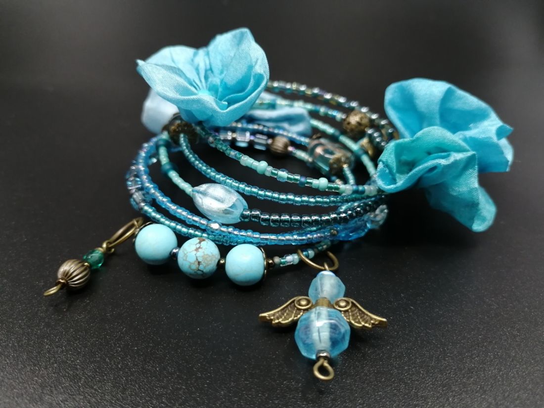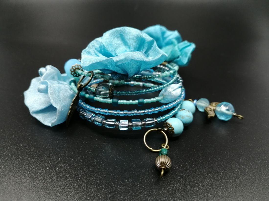 Színei: türkiz, világoskék, vízkék, türkizzöld, bronz színű bizsu alaktrészek