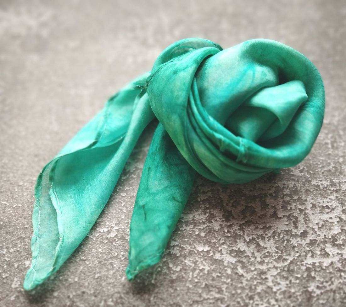 Balaton türkiz és barna színátmenetes hernyóselyem kendő kézzel festett valódi selyem hajkendő 90x90cm hideg árnyalatokban
