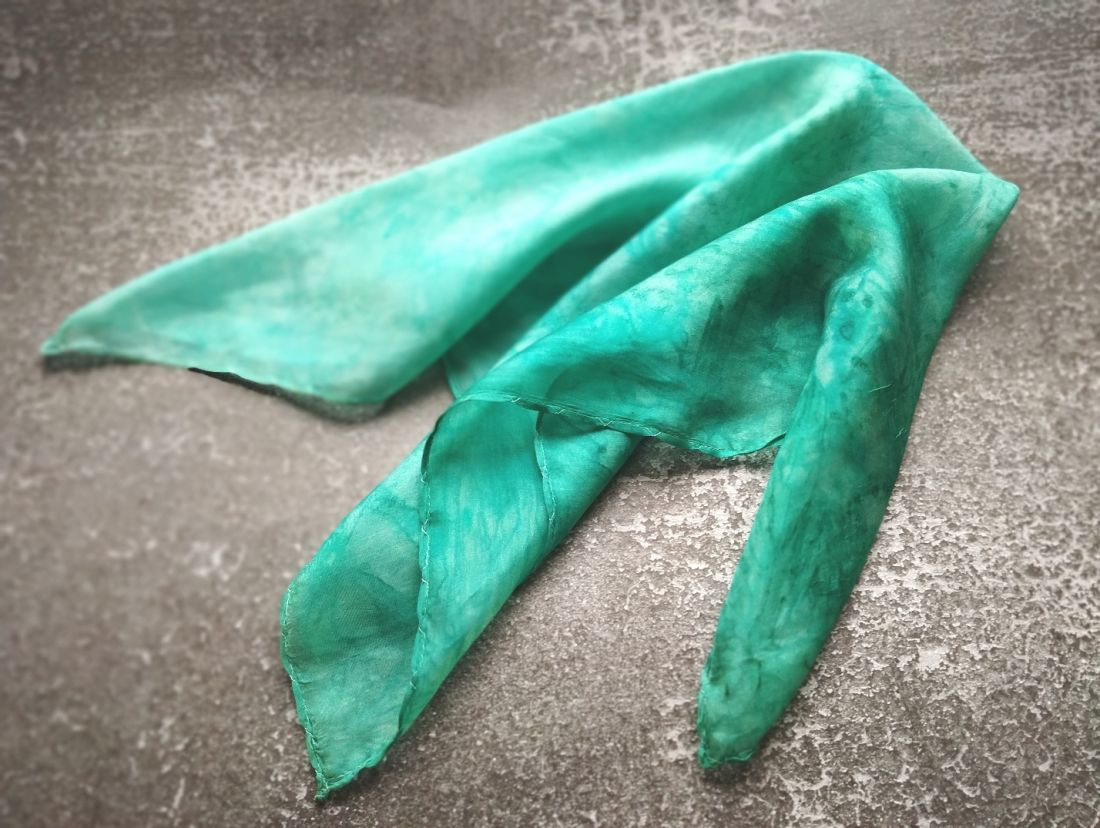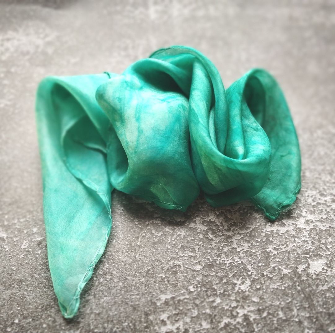 Balaton színátmenetes hernyóselyem kendő kézzel festett valódi selyem hajkendő Megrendelésre készül. 65x65cm méretben rendelhető hernyóselyem kendő Bármilyen két szín és ezeknek a színátmenetével készül.